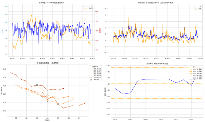 波动率曲线,具有相同到期日和标的资产而执行价格不同的期权。本文为方便观看,将波动率曲线简化为由虚值认沽期权(平值合约左半边图像)和虚值认购期权组成(平值合约右半边图像),行权价格偏离标的资产现货价格越远,隐含波动率越大。从隐含波动率的相对高低可以看出投资者对波动率的未来预期,从而选择合适的波动率进行入场与出场。