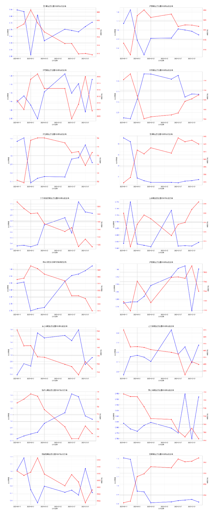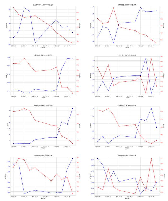 本周,商品期权市场情绪表现复杂多变,导致数据来看波动较大。从持仓量PCR的变化来看,可以发现以下几个关键点: