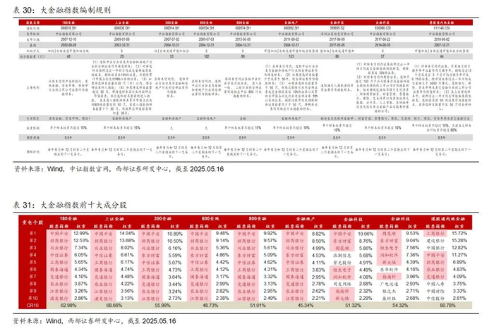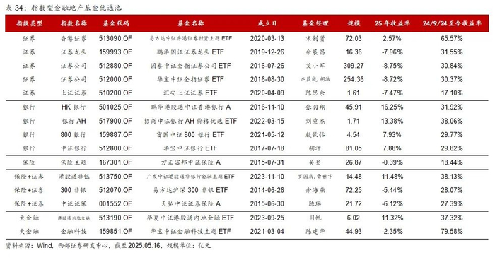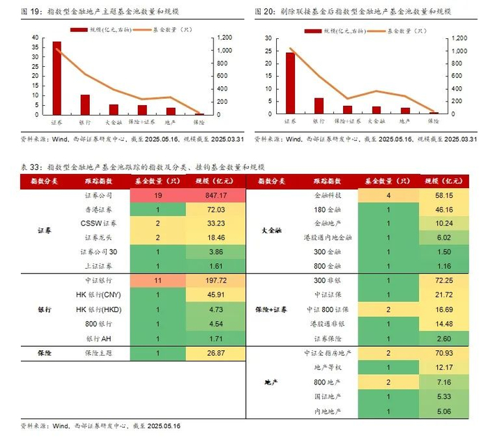 截止2025年5月16日,指数型金融地产主题基金数量为99只、规模为1917.15亿元,跟踪32个指数。我们将这32个指数分为证券、银行、保险、保险+证券、大金融、地产六大类。首先分析指数投资价值,再看基金布局,最后优选产品。