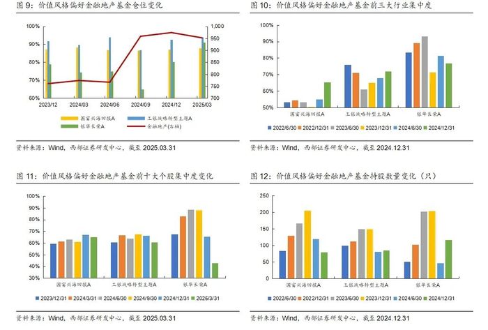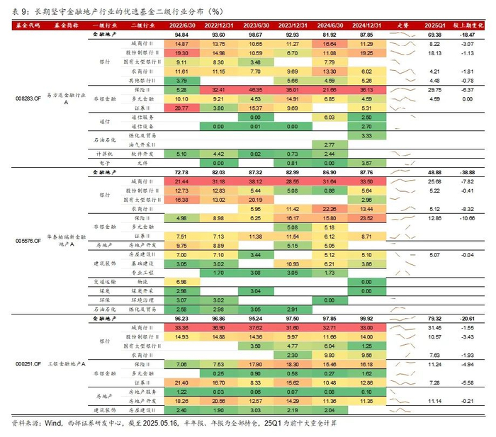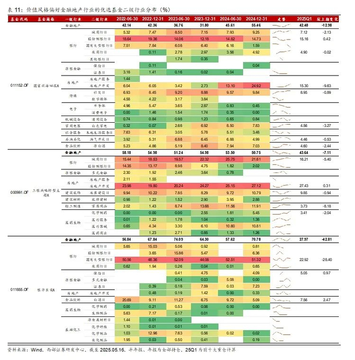 2、深度分析:细分赛道不同,配置方向分化。1)长期坚守金融地产行业的基金(第一类)高仓位,不择时,行业集中度高,聚焦金融地产,主要配置在银行和非银,地产配置较少,细分赛道主要为城商行。2)价值风格偏好金融地产的基金(第二类),细分赛道主要在大型国有银行、股份制银行、城商行、房地产开发。相对第一类基金,第二类基金在食品饮料、医药、建筑等行业上配置较多。3)25Q1,易方达金融行业减银行加证券、工银金融地产继续超配银行减保险和地产,银华长荣加白酒和家电,工银战略转型加成长和消费。4)华泰柏瑞新金融地产机构占比提高、规模增长显著,基金经理专注大金融投资。