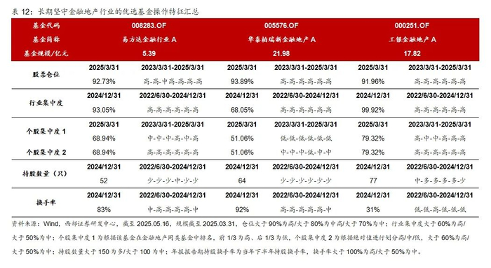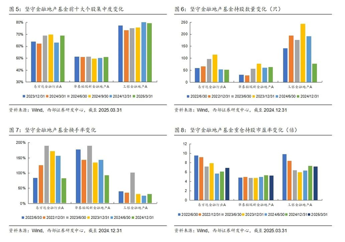 根据2类基金的25Q1季报来看,虽然易方达金融行业股票、华泰柏瑞新金融地产、工银金融地产这3只基金在合同层面约束主要投资金融地产主题,但是配置方向有所分化:易方达金融行业降低银行增加证券、工银金融地产继续超配银行降低保险和地产。3只价值风格偏好金融地产基金,目前仍然重点配置金融地产,尤其是银华长荣,仍然以银行为第一大重仓行业,但是在金融地产之外的行业配置上有分化,银华长荣增加白酒和家电,工银战略转型主题增配成长和内需消费。