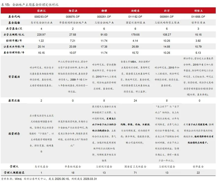 其次从定性角度优选,1)基金经理业绩一致性;2)基金在2023年、2024年、2025年、2023年以来不同区间收益和最大回撤;3)基金经理投资年限;4)基金经理背景履历;5)基金经理过往投资行业是否聚焦在金融地产板块;6)机构持有份额变化;7)管理人规模排名等。
