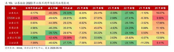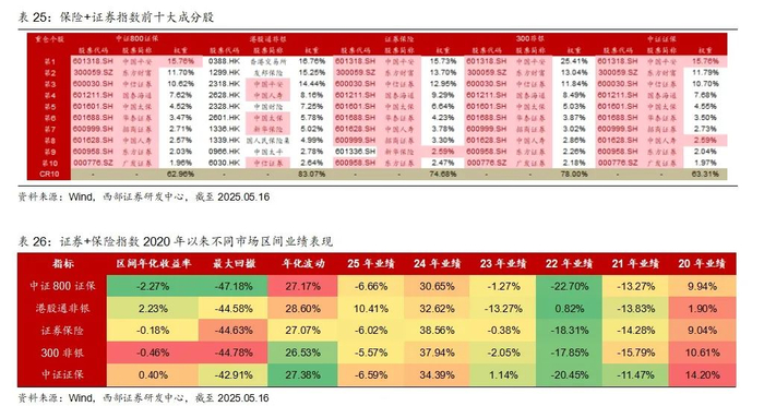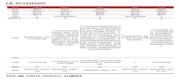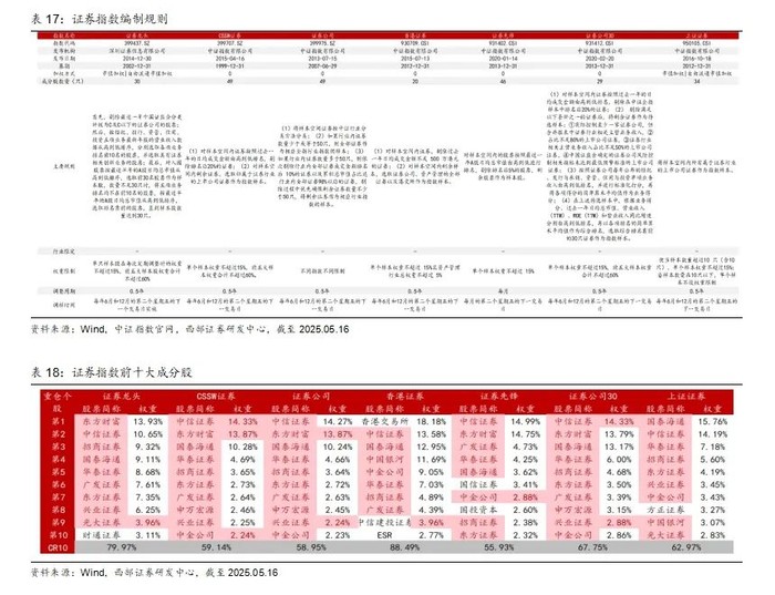 对比这7只指数的编制特点可以发现,1)香港证券为港股通范围、上证证券为沪市选股,其余均为A股全部;2)证券行业的成分股数量较少,在20只到49只之间;3)证券行业指数样本的选取关注业务、市值和收入;4)均设置了单个样本权重限制或者其他权重限制。除证券公司对不同指数有不同权重限制外,6个指数对单个样本权重均进行了15%的限制,证券龙头、CSSW证券、证券公司30对前五大样本权重限制不超过60%;另外,香港证券还对资产管理行业进行了限制,不超过5%;5)证券先锋为月度调整样本,其余是每半年调整一次。6)从前十大成分股来看,香港证券、证券先锋成分股与其他指数差异较大。证券公司、证券公司30、CSSW证券成分股与其他指数重合度较高,重合度较高的个股为中信证券、东方财富、招商证券、国泰海通、华泰证券、广发证券等。7)区间(20200101-20250516,下同)年化收益率上,香港证券表现最好,24年香港证券、证券先锋、证券公司30表现较好,25年以来香港证券、上证证券、证券先锋相对抗跌。