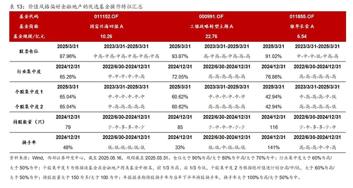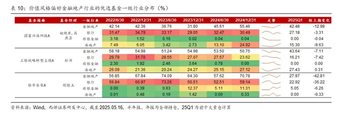 价值风格偏好金融地产的基金,国富兴海回报、工银战略转型主题、银华长荣在22H1-24H2共计6个报告期中,金融地产行业的持仓占比均值分别为42.35%、53.94%、65.25%,最小值分别为31.80%、50.75%、56.85%。