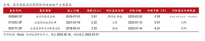目前21只金融地产基金池中,有3只基金在最近1年内更换基金经理,这3位基金经理目前公募基金经理年限不足1年或者其在管其他产品不以投资金融地产行业为主,且这3只基金没有在合同层面约束主要投资金融地产,故而我们先剔除这3只基金。其中,金信智能混合,过往历史业绩非常优异,且过去6个报告期(22H1-24H2)均聚焦于金融地产行业,但目前新任职基金经理公募基金投资年限短、在管产品不以金融地产行业为主、基金合同层面没有约束主投金融地产主题。目前任职的2位基金经理能力圈均不在金融地产,谭佳俊为量化投资风格,杨超偏成长风格。永赢惠添益混合、永赢惠添利灵活配置混合这2只基金过去均为李永兴管理,目前任职的两位基金经理风格偏均衡。