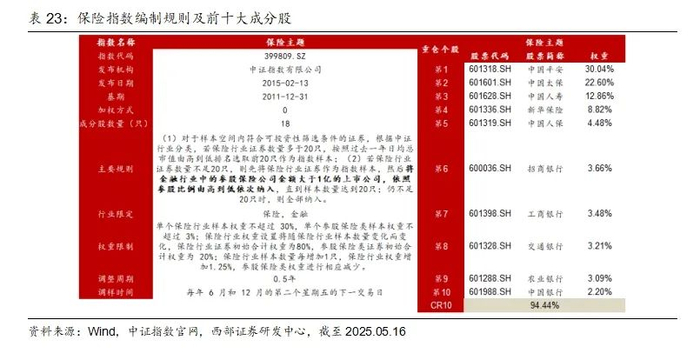 被动基金跟踪的保险主题指数只有1个,其选样规则中指出,如果保险行业样本数量不足20个,会根据指定的规则加入金融行业样本。前十大成分股中有中国平安、中国太保、中国人寿、新华保险、中国人保、招商银行、工商银行、交通银行、农业银行、中国银行。前十大个股集中度为94.44%。24年和20年业绩为正,分别为48.87%和4.59%。