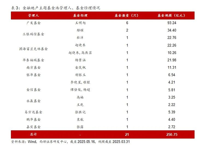 在此基础上,筛选出金融地产主题基金池。根据上述标准,可筛选出金融地产主题基金39只,其中规模不小于2亿元的21只。这21只金融地产主题基金,涵盖11家公募基金管理人、18位基金经理,规模合计250.75亿元。