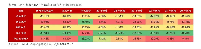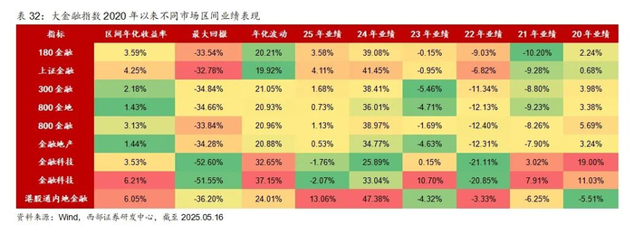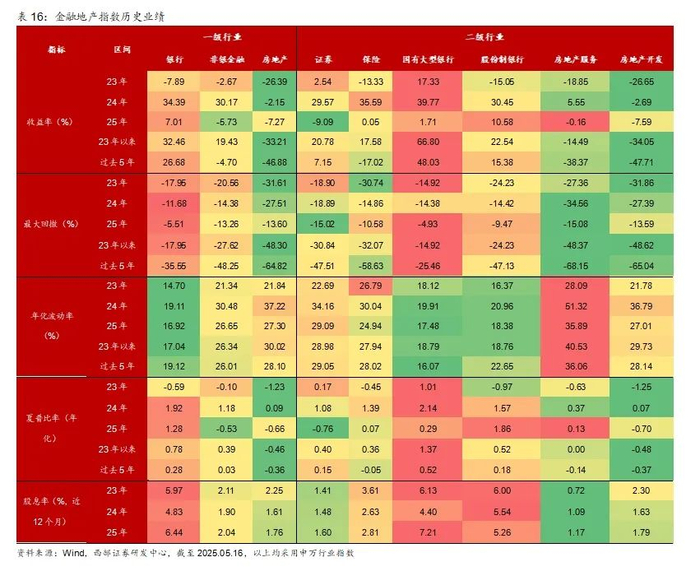 我们从区间收益率、最大回撤、年化波动率、夏普比率、股息率对比银行、券商、保险、地产等指数:1)从区间收益率来看,银行表现最好,其中国有大型银行表现优于股份制银行;证券和保险在不同年份各有领先,从23年以来(截至2025.05.16,下同)、过去5年这两个区间来看,证券好于保险。2)从最大回撤来看,银行回撤最小,尤其是国有大行,长期来看证券回撤好于保险。3)从年化波动率来看,银行<保险<证券,地产波动率较大。4)从夏普来看,银行最高,其次为保险、证券,24年、25年以来,保险夏普高于证券。5)从股息率来看,银行>保险>证券,其中国有银行和股份制银行均具有明显领先优势。