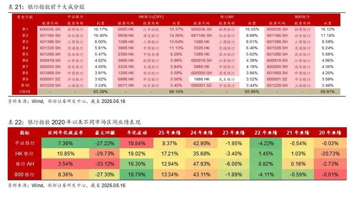 被动型金融地产基金中,跟踪的银行指数有4只,分别为中证银行(399986.SZ)、HK银行(HKD)(930792.CSI)、HK银行(CNY)(930793.CSI)、银行AH(931039.CSI)和800银行(h30022.CSI)。从前十大成分股来看,中证银行和800银行10只股票均相同,且顺序一致;银行AH中与这两个指数仅民生银行不同,但工行、交行、农行等选择港股。区间收益率上,银行AH表现最好,800银行与中证银行在不同年份收益相差不大,800银行略好一些,银行AH波动较大,主要在24年以来表现较好。