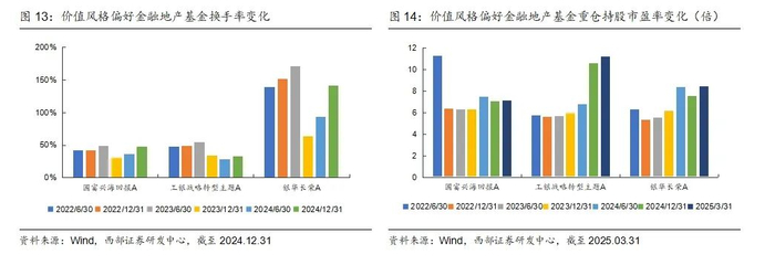 第三类,中观行业选择,最新2个报告期金融地产行业占比较高。基金在统计的7个报告期(21H2-24H2),金融地产配置比例并不高,并非严格金融地产主题基金,主要是跟随行业景气度变化,近期配置到金融地产行业。