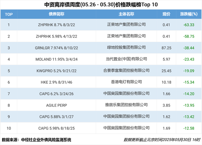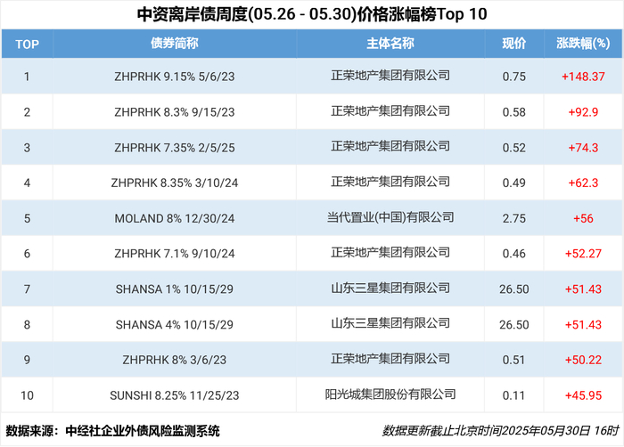 据中国经济信息社企业外债风险监测系统,本周中资离岸债周度涨幅最大的是正荣地产发行的中资美元债券(ZHPRHK 9.15% 5/6/23),周度上涨148.37%,报0.75。
