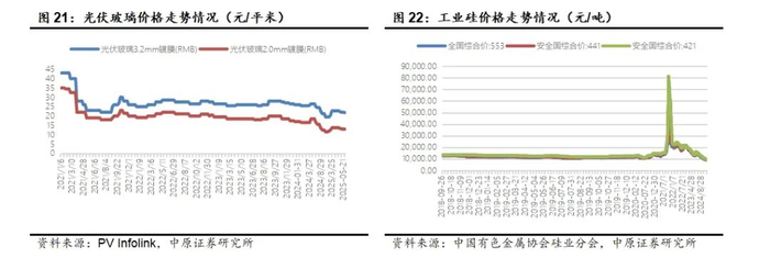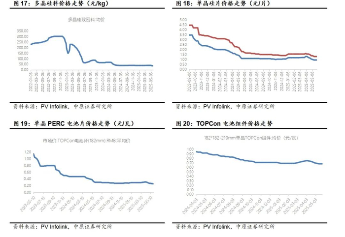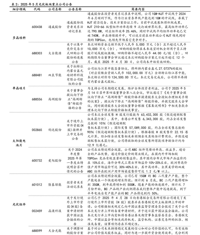 多晶硅价格低位运行,去库存、去产能将持续进行。根据PV Infolink的统计,截至2025年5月28日,国内多晶硅致密料均价为36元/公斤。根据中国有色金属协会硅业分会披露的数据,截至2025年4月底,我国多晶硅库存约为39万吨,如果按照目前下游消费情况,预计足够企业进行超3个月的正常生产。多晶硅生产企业数量由此前13家减少至11家,部分企业倾向于暂停生产进行检修,且后续部分企业也将有新增停产检修计划。同时,头部企业正在积极进行产能置换,用运行较为良好的小产线替换大产线。考虑到多晶硅价格持续跌破现金成本对企业造成持续失血,供给端压缩将持续进行,多晶硅价格进一步下行的空间有限,但在高库存和需求预期偏弱背景下亦难以走强。