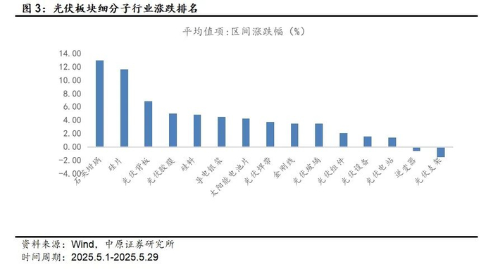 大部分细分子行业均取得正向收益,石英坩埚、单晶硅片以及背板涨幅居前。光伏各细分子行业涨跌幅排名:石英坩埚(12.98%)、硅片(11.65%)、光伏背板(6.86%)、光伏胶膜(5.07%)、硅料(4.85%)、导电银浆(4.56%)、太阳能电池片(4.29%)、光伏焊带(3.73%)、金刚线(3.55%)、光伏玻璃(3.50%)、光伏组件(2.11%)、光伏设备(1.61%)、光伏电站(1.44%)、逆变器(-0.59%)、光伏支架(-1.55%)。
