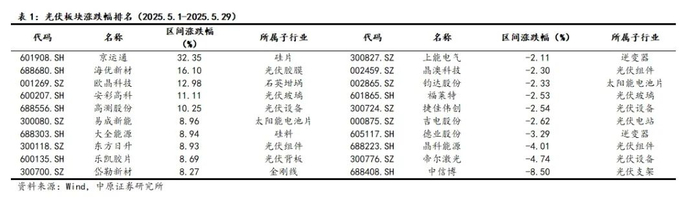 5月光伏板块个股涨多跌少。涨跌幅榜排名前十名:京运通、海优新材、欧晶科技、安彩高科、高测股份、易成新能、大全能源、东方日升、乐凯胶片、岱勒新材;涨跌幅榜排名后十名:中信博、帝尔激光、晶科能源、德业股份、吉电股份、捷佳伟创、福莱特、钧达股份、晶澳科技和上能电气。