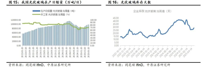 光伏玻璃日熔量呈回升态势。受光伏玻璃产能过剩等因素影响,光伏玻璃企业窑炉检修进而压低有效产能。根据同花顺IfinD的统计数据,2025年2月,光伏玻璃在产日熔量降至8.02万吨。受前期检修装置恢复生产以及“430”、“531”抢装等因素影响,光伏玻璃产能从底部攀升,五月下旬日熔量达9.87万吨,开工率70.34%,库存天数28天。展望后市,预计光伏组件需求回落后,行业再次进入去库周期,中长期来看,大窑炉、低成本产能挤占高成本产线实现优胜劣汰。