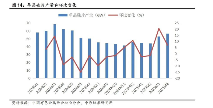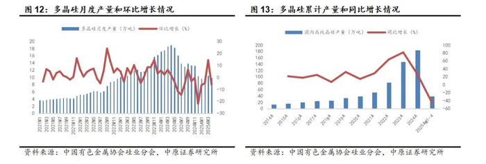 多晶硅行业继续减产。根据中国有色金属协会硅业分会统计,2025年4月,我国多晶硅产量为9.91万吨,环比下降6.08%。多数企业进入停工检修状态,在产企业减少至11家。同时,根据协会披露的数据显示, 截至2025年4月底,我国多晶硅库存约为39万吨,如果按照目前下游消费情况,预计足够企业进行超3个月的正常生产。头部企业正在积极进行产能置换,用运行较为良好的小产线,替换已经生产的大产线。多晶硅行业产能出清周期漫长,供需扭转尚需时日。