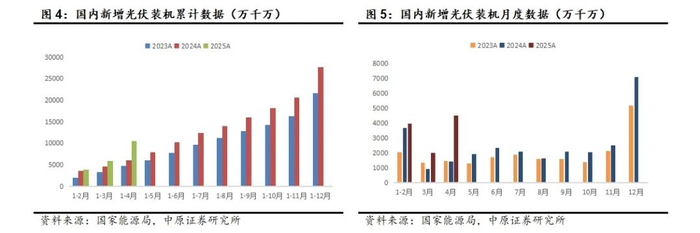 2025年4月国内新增光伏装机大幅增长。根据国家能源局披露的数据,2025年4月,国内新增光伏装机容量45.22GW,同比增长214.68%;1-4月,国内累计新增光伏装机104.93GW,同比增长74.56%。全国累计发电装机容量34.9亿千瓦,同比增长15.9%。其中,太阳能发电装机容量9.9亿千瓦,同比增长47.7%;风电装机容量5.4亿千瓦,同比增长18.2%。1-4月份,全国发电设备累计平均利用1008小时,比上年同期降低103小时;全国主要发电企业电源工程完成投资1933亿元,同比增长1.6%;电网工程完成投资1408亿元,同比增长14.6%。政策节点临近,工商业项目和分布式光伏项目为了锁定政策红利,集中赶工,导致单月装机规模快速增长。