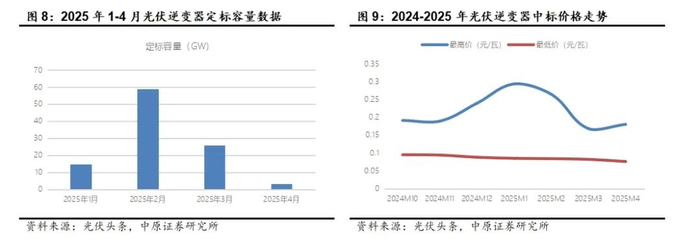 四月单月光伏逆变器定标规模环比缩量。根据光伏头条统计,2025年1-4月,国内央国企光伏逆变器定标规模113.21GW,同比略增1.23%;光伏逆变器价格方面,定标价格继续呈现缓慢下跌趋势,其中,最低价格下谈到0.076元/W,最高价格0.293元/瓦;从参与结构来看,央企定标容量104.92GW,占比94.97%,成为市场的决定力量;从技术路线上看,组串式逆变器容量96.26GW,占比85%。中标企业方面,华为(6890MW),株洲变流(5942MW),上能电气(4468MW),阳光电源(3130MW)、特变电工(2192MW)、双杰电气(1094MW)、正泰电源(910MW)、锦浪科技(890MW)、速仁电子(500MW)、固德威(469MW)中标规模排名靠前。