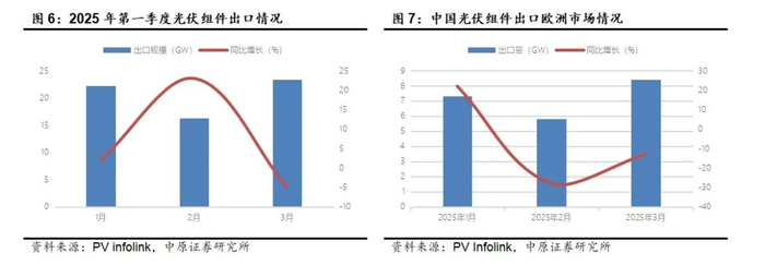 2025年第一季度海外光伏产品出口量价齐减,传统欧美市场疲软。根据PV infolink的统计,2025年第一季度,我国光伏组件出口量61.9GW ,同比减少8%;累计出口金额460.80亿元,同比下滑28.5%。除非洲之外的其他区域市场需求均下跌,主要受中国印发《关于深化新能源上网电价市场化改革 促进新能源高质量发展的通知》政策影响。多数厂家优先供应国内抢装,多数组件厂家暂缓或延期海外低价订单交付,导致海外市场供货量体略为缩减。