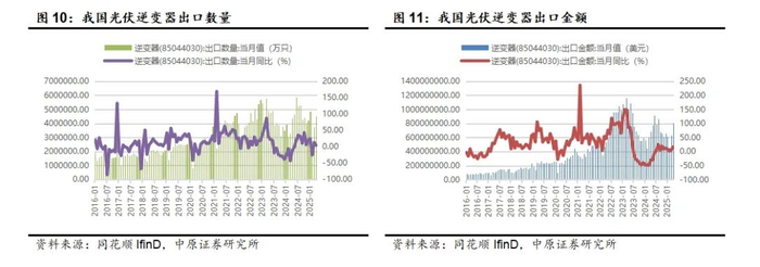 四月光伏逆变器出口明显改善。根据同花顺ifind的数据,2025年4月,国内光伏逆变器当月出口数量452.92万台,同比增长1.13%,环比增长21.35%;当月出口金额8.09亿美金,同比增长16.71%,环比增长27.80%。