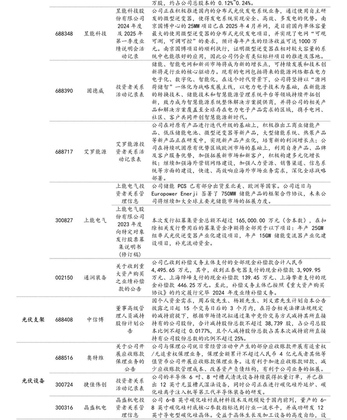投资建议:四月国内新增光伏装机受抢装影响继续呈现高速增长态势,然而需求前置将导致后续国内市场后劲不足。行业阶段性需求提升并未彻底扭转供给过剩格局,去库存和过剩产能出清仍将是行业下半年的主基调。目前光伏板块估值处于历史低位,但基本面拐点尚未出现。建议中期关注亏损力度较大、产能出清预期明确的主辅材领域和技术创新领域。关注光伏玻璃、一体化组件厂、多晶硅料、电子银浆、BC电池以及钙钛矿电池领域头部企业。