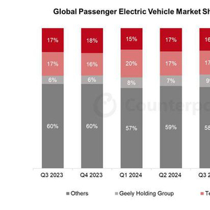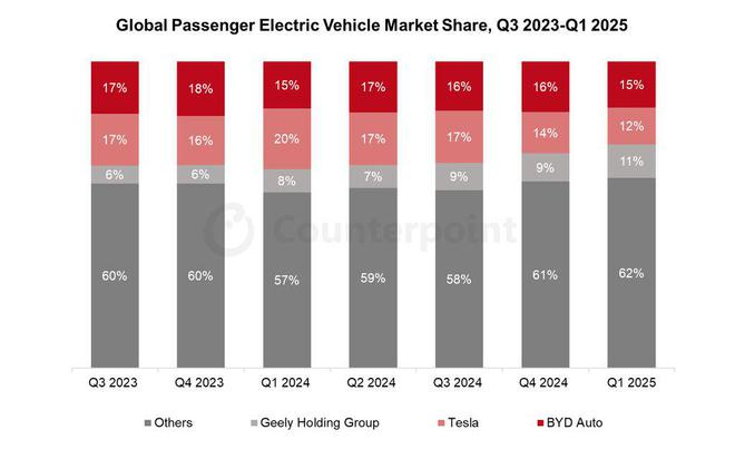 CounterPoint 报告 2025Q1 全球乘用电动车:比亚迪占 15%