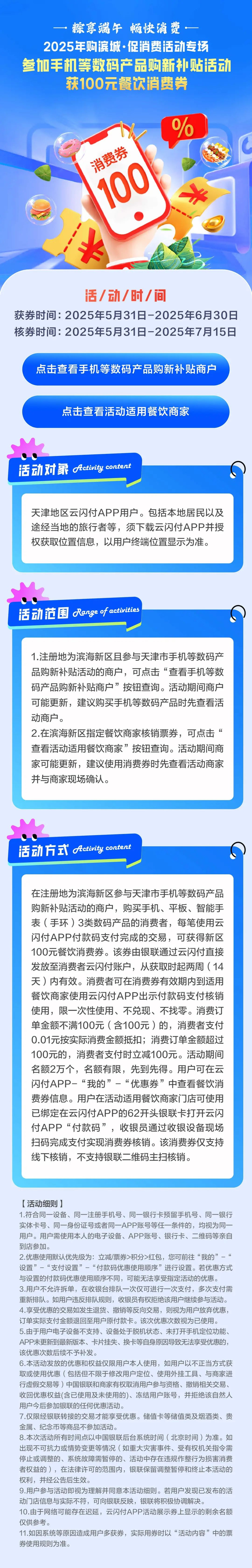 手机等数码消费券覆盖范围包括注册地为滨海新区且参与天津市手机等数码产品购新补贴活动的商户。购买手机、平板、智能手表(手环)3类数码产品的消费者,每笔使用云闪付App付款码支付完成的交易,可获得新区100元餐饮代金券。该券由银联通过云闪付直接发放至消费者云闪付账户,从获得时起两周(14天)内有效。活动于5月31日启动,持续至6月末。