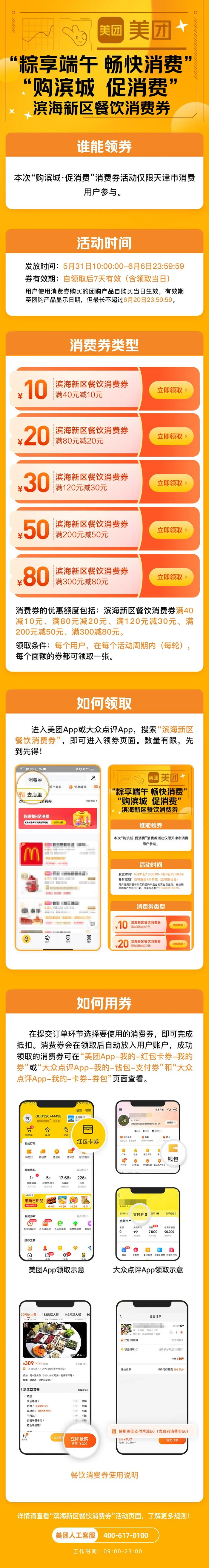 其中,餐饮消费券通过美团、大众点评App发放,面额涵盖10元(满40减10)、20元(满80减20)、30元(满120减30)、50元(满200减50)、80元(满300减80)等多档。活动于5月31日上午10:00启动,消费者可登录平台搜索“滨海新区餐饮消费券”领取,发放时间为5月31日至6月6日。