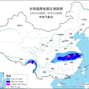 5月31日至6月2日,青藏高原东部及中东部地区将有一次较大范围降水过程,江汉中南部、江淮西部、江南、华南北部及西藏东南部、贵州、云南西部和东部等地先后有中到大雨,其中,湖北、湖南北部、安徽南部、江西北部、浙江中部及西藏东南部、云南西北部等地部分地区有暴雨、局地大暴雨;并伴有局地短时强降水、雷暴大风等强对流天气。预计,5月31日08时至6月1日08时,西藏东南部、云南西部、重庆大部、贵州北部、湖北大部、湖南北部、江西北部、安徽中部和南部、江苏西南部、浙江中北部等地部分地区有大到暴雨,其中,西藏东南部、云南西北部、安徽中南部、湖北南部等地部分地区有大暴雨(100~140毫米)。上述部分地区伴有短时强降水(最大小时降雨量20~40毫米,局地可超过50毫米),局地有雷暴大风等强对流天气(见图1)。 中央气象台5月31日08时发布暴雨黄色预警。