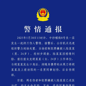 陆某某(男,26岁)持刀伤害前女友及劝阻的男同事,随后自伤颈部,警方通报