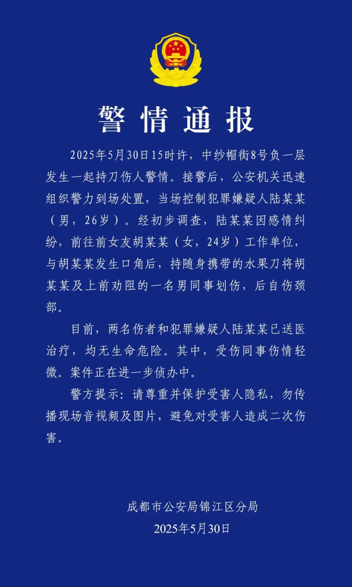 目前,两名伤者和犯罪嫌疑人陆某某已送医治疗,均无生命危险。其中,受伤同事伤情轻微。案件正在进一步侦办中。警方提示:请尊重并保护受害人隐私,勿传播现场音视频及图片,避免对受害人造成二次伤害。