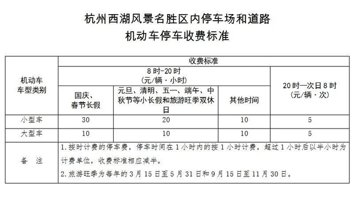 依照相关部门规定,端午法定假期期间,西湖景区价格浮动的政府定价停车场具体收费标准如下:白天(8时—20时)小型车20元/辆·小时,大型车10元/辆·小时;夜间(20时—次日8时)大、小型车均为5元/辆·次。