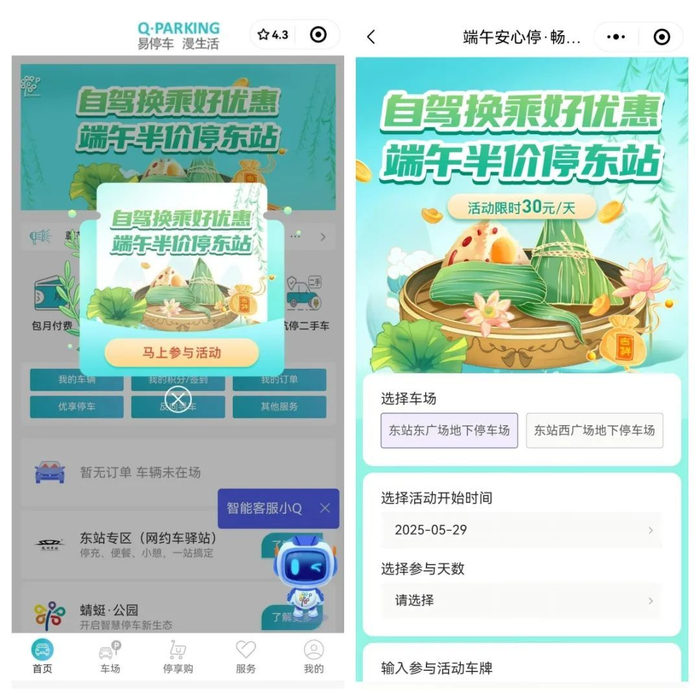 端午佳节已至,出行热潮来临,杭停股份推出“自驾换乘好优惠 端午半价停东站”主题活动。