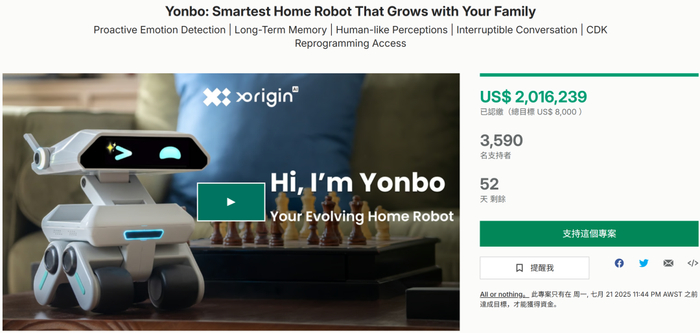 据了解,玄源科技成立于2021年末,专注于消费级AI机器人研发,致力于打造覆盖儿童、成人及老年全场景的智能伴侣生态。就在5月22日,玄源科技(X-Origin AI)推出了首款AI陪伴机器人Yonbo,首日登陆海外众筹平台Kickstarter便突破百万美金众筹额。截至5月30日上午,售价399-599美元的Yonbo已获3590人支持,众筹总金额高达201.6万美元(约合人民币1449.0万),而其众筹剩余时间尚有52天之多。