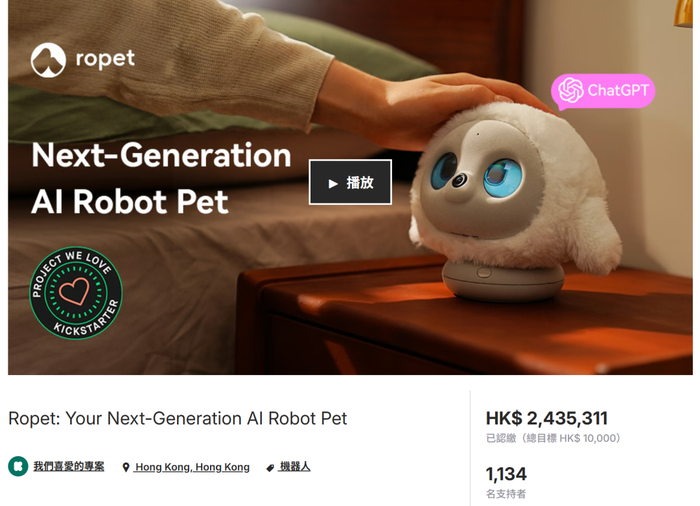 公开数据显示,Ropet于去年12月上线众筹平台Kickstarter及Indiegogo,最低价格为169美元。截至发稿日,其在两大平台共计获得2459人的支持,总众筹金额为544.72万港币。