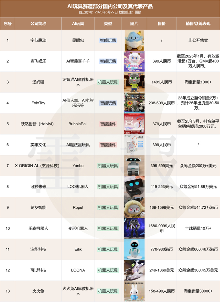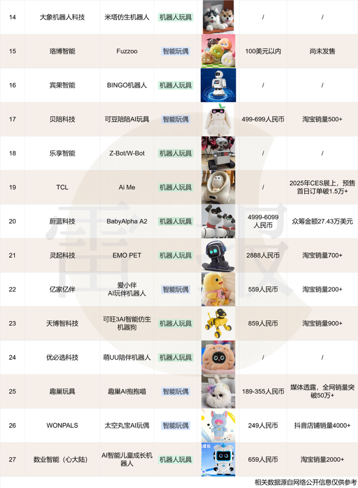 除了上述这些融资公司的产品外,还有更多公司也都推出了自己的AI玩具产品,且不少在众筹平台或消费市场中表现不俗。据雷报不完全统计,包括上述融资公司在内,国内市场已推出AI玩具的公司至少有27家。具体情况如下: