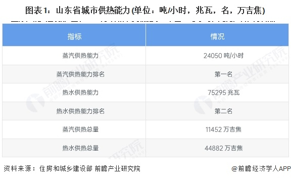 1、山东省供热能力概览:蒸汽供热能力排名第一,热水供热能力排名第二