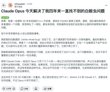 Reddit 上一位拥有 30 多年经验的 C++ 开发者发帖表示,Claude Opus 4 解决了一个困扰他四年的 Bug,而且是他用过的第一个能做到这件事的 AI。