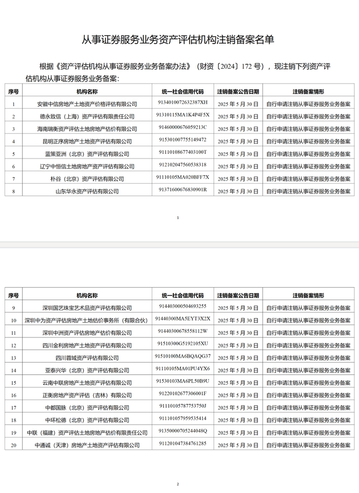 根据《资产评估机构从事证券服务业务备案办法》(财资〔2024〕172号),以下资产评估机构的证券服务业务备案被注销,注销备案公告日期均为2025年5月30日,注销备案情形均为自行申请注销从事证券服务业务备案: