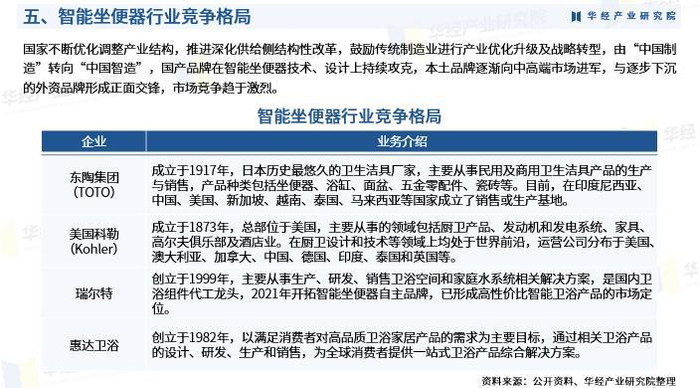 国家不断优化调整产业结构,推进深化供给侧结构性改革,鼓励传统制造业进行产业优化升级及战略转型,由“中国制造”转向“中国智造”,国产品牌在智能坐便器技术、设计上持续攻克,本土品牌逐渐向中高端市场进军,与逐步下沉的外资品牌形成正面交锋,市场竞争趋于激烈。