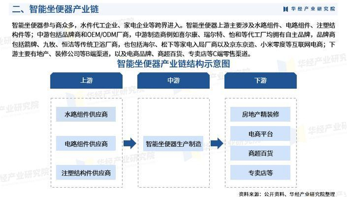 智能坐便器参与商众多,水件代工企业、家电企业等跨界进入。智能坐便器上游主要涉及水路组件、电路组件、注塑结构件等;中游包括品牌商和OEM/ODM厂商,中游制造商例如喜尔康、瑞尔特、怡和等代工厂均拥有自主品牌,品牌商包括箭牌、九牧、恒洁等传统卫浴厂商,也包括海尔、松下等家电入局厂商以及京东京造、小米零度等互联网电商;下游主要有地产、装修公司等B端渠道,以及电商品牌、商超百货、专卖店等C端零售渠道。