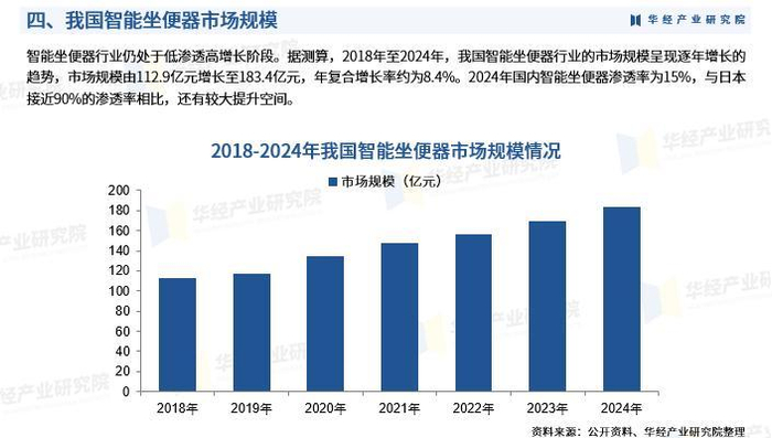 智能坐便器行业仍处于低渗透高增长阶段。据测算,2018年至2024年,我国智能坐便器行业的市场规模呈现逐年增长的趋势,市场规模由112.9亿元增长至183.4亿元,年复合增长率约为8.4%。2024年国内智能坐便器渗透率为15%,与日本接近90%的渗透率相比,还有较大提升空间。