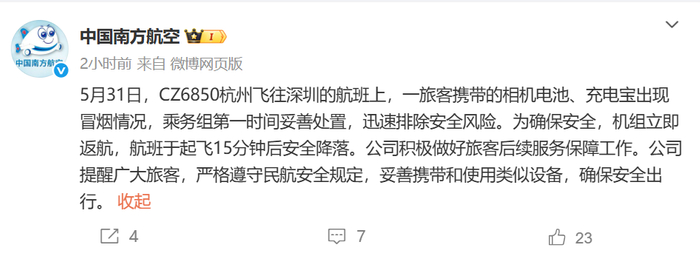5月31日,CZ6850杭州飞往深圳的航班上,一旅客携带的相机电池、充电宝出现冒烟情况,乘务组第一时间妥善处置,迅速排除安全风险。为确保安全,机组立即返航,航班于起飞15分钟后安全降落。