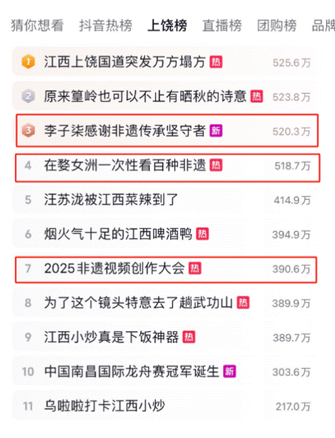 大会期间,抖音设立“非遗守护人”专题,通过优质内容及平台流量的共同推动,#2025非遗视频创作大会 #在婺女洲一次性看百种非遗 #闭关半年李子柒现身婺源 #李子柒感谢非遗传承坚守者 等多个话题词条冲上了抖音热搜,#王晓峰谈非遗保护 等相关话题也登上了抖音热点榜单,获得破千万次关注,#非遗青年说 话题播放量超7000万次;快手在活动期间,发起了#非遗视频创作大会 #老铁梨园 #新市井好角儿 #新市井匠人等多个热点话题,联动百位优秀非遗创作者,通过流量扶持、话题曝光、官方宣推、商业变现等多种方式,推动非遗在短视频平台创新发展。