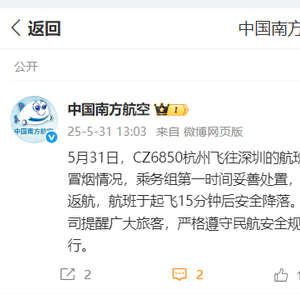 5月31日,中国南方航空发文:CZ6850杭州飞往深圳的航班上,一旅客携带的相机电池、充电宝出现冒烟情况,乘务组第一时间妥善处置,迅速排除安全风险。为确保安全,机组立即返航,航班于起飞15分钟后安全降落。