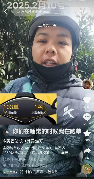 很快他的“晒单”短视频招致了不少同城外卖骑手的不满。因为晒战绩证明自己在上海跑单高收入,容易形成“炸窝”现象,即外地的骑手被晒出的高收入吸引,纷纷转投上海跑单,导致竞争更加激烈。