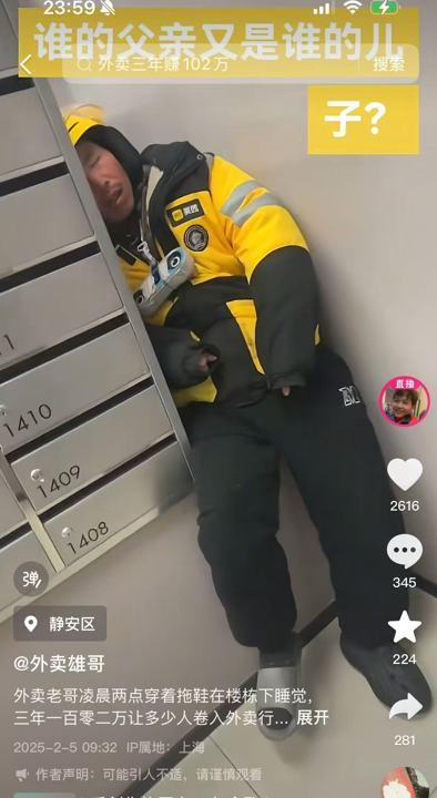 同样为了追求流量,陈笑的账号走的是“苦情路线”。在他置顶的几个高流量短视频中,展现骑手艰辛不易的内容占了大多数。其中一条点赞2000多的视频,讲述的是一位老年骑手,送餐间隙累得在楼道信箱和电梯间的夹缝里睡着了,配上煽情的音乐,视频打出一行大字幕“谁的父亲又是谁的儿子?”陈笑说这段视频,是他的朋友无意中拍摄的,他看后认为一定会引发人们共情,就向朋友把素材要过来剪辑发布了。