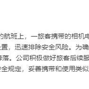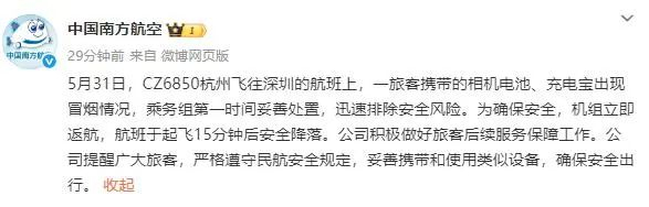 @中国南方航空 微博通报,5月31日,CZ6850杭州飞往深圳的航班上,一旅客携带的相机电池、充电宝出现冒烟情况,乘务组第一时间妥善处置,迅速排除安全风险。为确保安全,机组立即返航,航班于起飞15分钟后安全降落。公司积极做好旅客后续服务保障工作。公司提醒广大旅客,严格遵守民航安全规定,妥善携带和使用类似设备,确保安全出行。