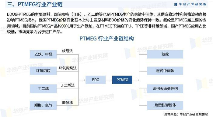 氨纶是PTMEG最主要的应用领域,目前国内PTMEG产品约90%用于生产氨纶,在PTMEG下游的TPU、TPEE等非纤维领域,国产PTMEG应用占比较低,市场竞争力弱于进口产品。