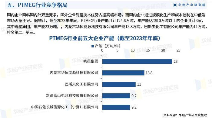 国内企业面临国内外双重竞争,国外企业凭借技术优势占据高端市场,而国内企业通过规模化生产和成本控制在中低端市场占据主导。据统计,截至2023年年底,PTMEG行业产能共计124.6万吨,年产能达到10万吨以上的企业共计3家,其中晓星集团,年产能23万吨,;内蒙古华恒能源科技有限公司年产能13.8万吨,巴斯夫化工有限公司年产能为11万吨,排名第二、第三。